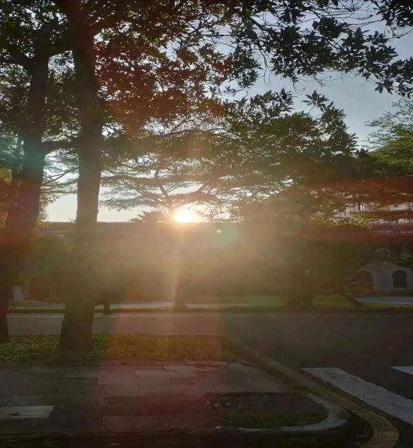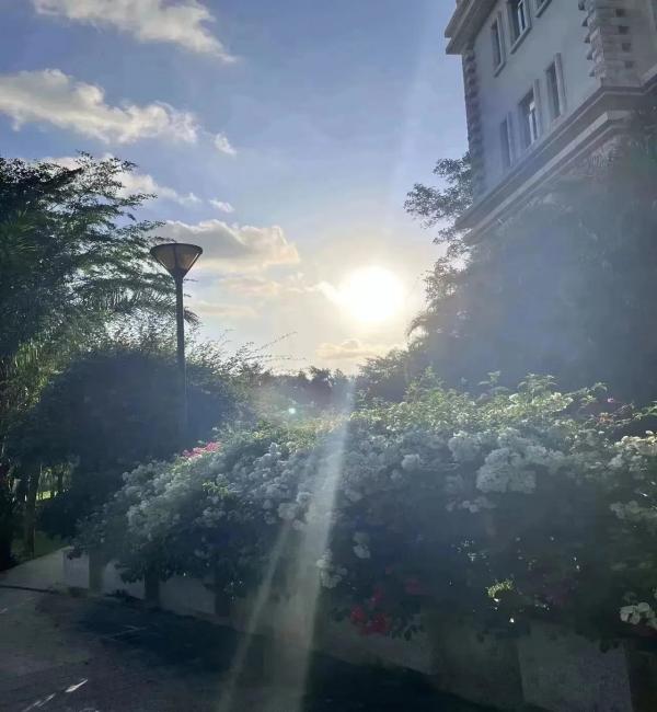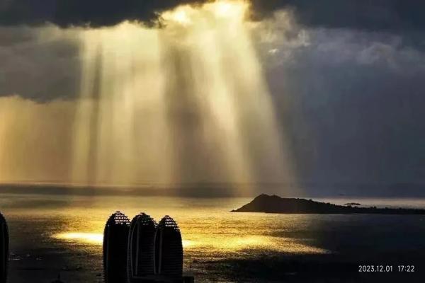 “上周和朋友一起去爬臨春嶺公園。登山的路途遙遠且陡峭,不過在相互的鼓勵下,花了半個小時,終是到達了山頂。到達山頂之初,只感覺到了愜意涼風(fēng)。隨著我們登上?t望塔,三亞市區(qū)的全貌漸漸清晰,景色也盡收眼底。起初,只是遠遠瞧見了灰蒙蒙的大海與無邊無際的天緊緊連接在一起。后來,隨著云層的移動,數(shù)縷金光透過云層,照射在了海面上。海面金光閃閃,金光照射的路徑也層層分明,三亞這座濱海城市,在此時顯得無比的寧靜、精美。我們一邊贊嘆著自然景色的唯美,一邊用手機記錄下了此刻的三亞。"