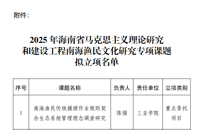近日,海南省馬克思主義理論研究和建設(shè)工程專項(xiàng)課題管理辦公室發(fā)布《關(guān)于2025年海南省馬克思主義理論研究和建設(shè)工程南海漁民文化研究專項(xiàng)課題擬立項(xiàng)名單的公示》,我校社會學(xué)院陳強(qiáng)教授申報(bào)的“南海漁民傳統(tǒng)捕撈作業(yè)規(guī)則契合生態(tài)系統(tǒng)管理理念調(diào)查研究”獲批為重點(diǎn)委托項(xiàng)目,資助經(jīng)費(fèi)10萬元。該課題通過深入挖掘南海漁民傳統(tǒng)捕撈作業(yè)方式和理念的文化與生態(tài)雙重價(jià)值,研究其中蘊(yùn)含的生態(tài)文明智慧,以及對現(xiàn)代生態(tài)系統(tǒng)管理的理論和實(shí)踐價(jià)值,闡發(fā)其對構(gòu)建海洋命運(yùn)共同體的貢獻(xiàn)和意義,通過綜合運(yùn)用多學(xué)科、跨學(xué)科話語開展體系化、學(xué)理化闡釋。近年來,陳強(qiáng)教授專注于南海航海史和南海漁民文化研究,其成果在相關(guān)領(lǐng)域產(chǎn)生一定影響力。