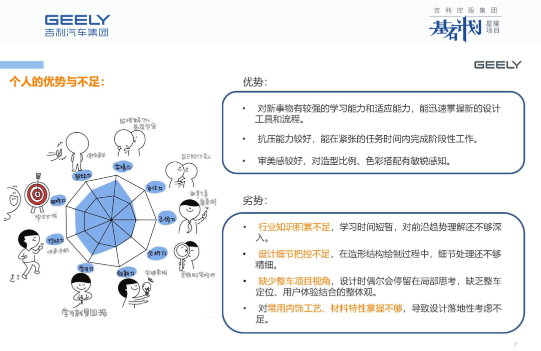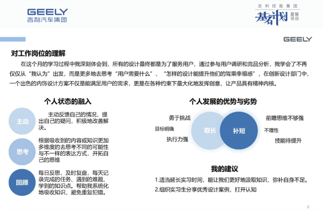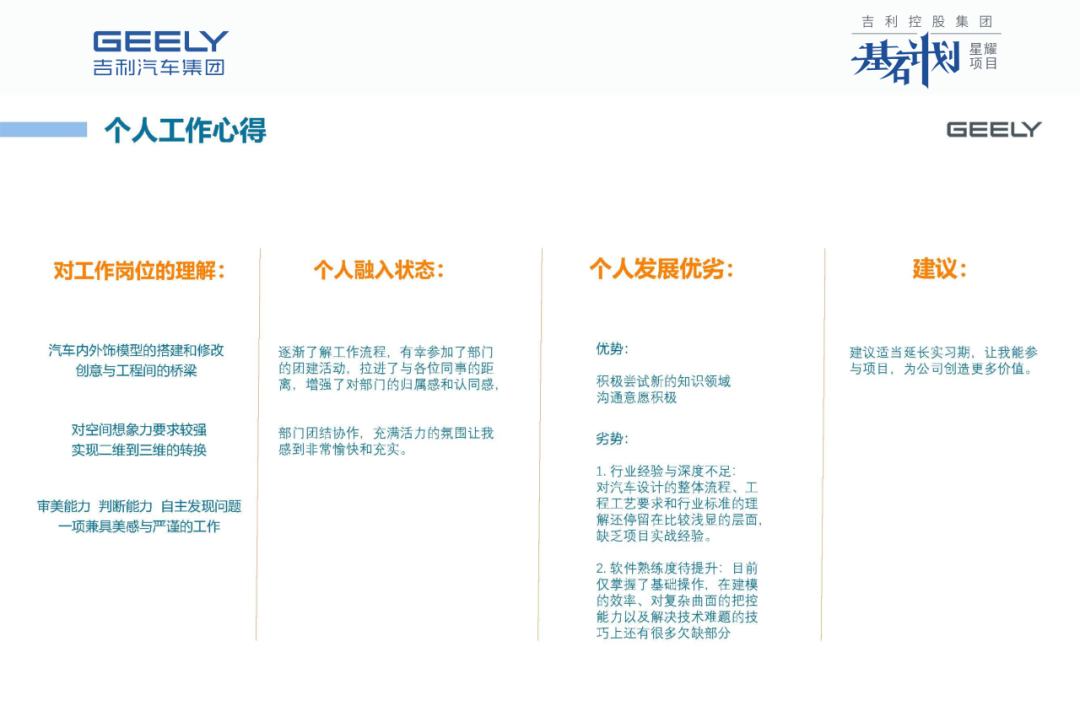 這次實(shí)習(xí)讓我接觸到真實(shí)項(xiàng)目,與一線設(shè)計(jì)師交流,深刻體會(huì)到設(shè)計(jì)是始于問題、忠于落地、將創(chuàng)意轉(zhuǎn)化為產(chǎn)品的過程。我認(rèn)識(shí)到自身不足,未來將繼續(xù)深入學(xué)習(xí),提升設(shè)計(jì)認(rèn)知與技能,為成為一名合格汽車設(shè)計(jì)師并加入吉利不斷努力。